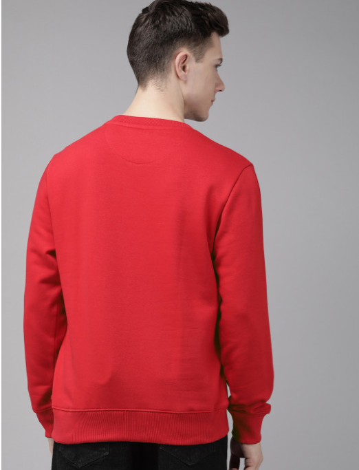 Red brand logo printed sweatshirt has a round neck, short sleeves, ribbed hem